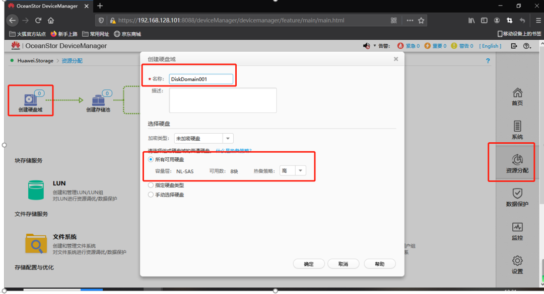 点“资源分配”,创建“硬盘域”,输入对应名称,选择硬盘和热备策略