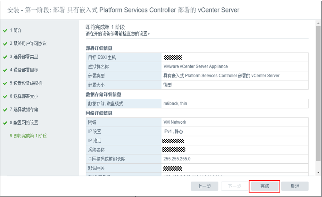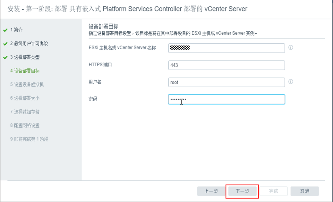 在指定部署目标中指定运行该VCSA的ESXI主机并输入用户名和密码,需要注意的是vCenter Server Appliance 版本 6.5 上部署了虚拟硬件版本 10,所以该部署目标必须可以运行虚拟硬件版本10