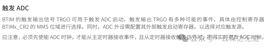 主定时器的更新事件作为从定时器的时钟源,实现不同频率的定时。多个定时器通过TRGO同步启动,实现精确的协同工作。利用TRGO产生PWM信号,控制电机、伺服等执行机构。TRGO可以触发ADC采样,实现周期性的数据采集。TRGO可以用于实现通信协议的同步。