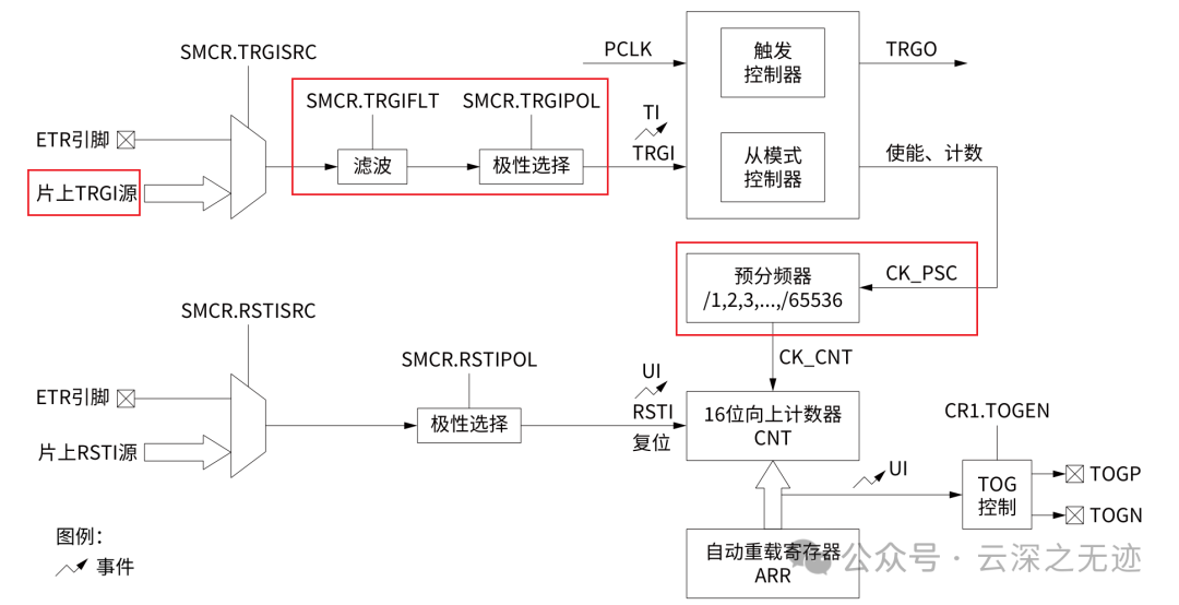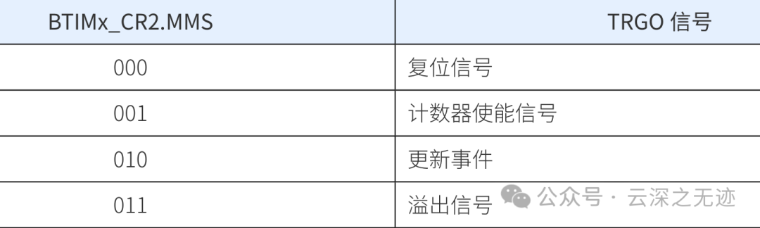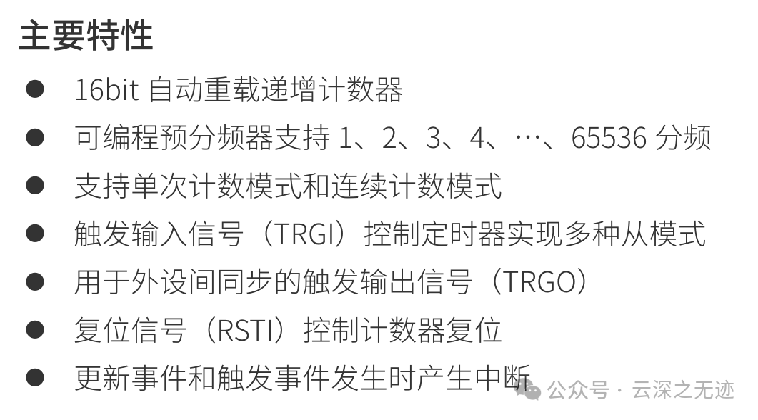 使能: 定时器使能信号可以作为TRGO,用于同步启动多个定时器。