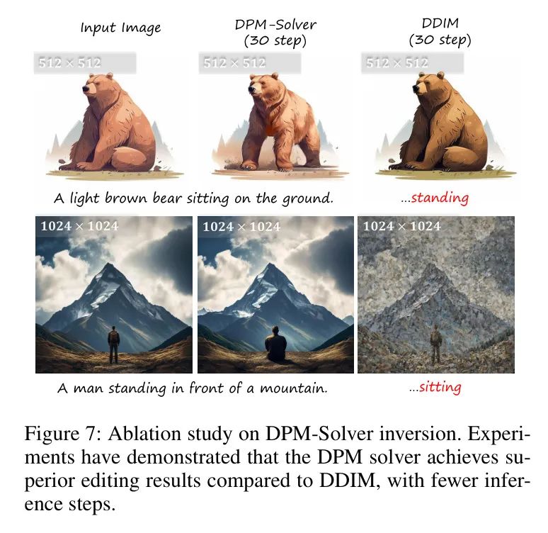 当比较两种方法在相同推理步数()下,DPM Solver在图像编辑质量上始终优于DDIM。这表明作者使用DPM-Solver反演策略允许生成优质潜在图,从而在更少的步骤内获得更好的编辑结果。