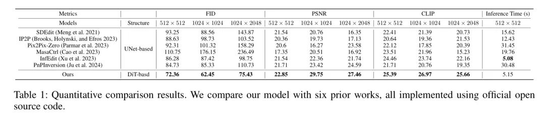 对于定量评估,作者使用了三个指标:Frechet Inception Distance(FID)[10],Peak Signal-to-Noise Ratio(PSNR)和CLIP,来评估作者的模型与最先进方法在图像生成质量、背景保留和文本对齐方面的性能差异。作者比较了三个大小的图像:,和,详细的结果请参见表1。作者使用Pix2Pix-Zero,PnPInversion,SDEdit,IP2P,MasaCtrl和InfEdit进行性能测试。需要注意的是,由于没有基于DiT的编辑框架,作者的比较 Baseline 都基于UNet架构。实验结果显示,作者提出的DiT4Edit编辑策略在图像生成质量、背景保留和文本对齐方面都超过了最先进方法。由于集成 Transformer 结构的全球注意力能力,DiT4Edit框架在各种大小的编辑任务上表现出强大的鲁棒性。生成的图像不仅显示更高的质量,还提供了更好的背景和细节控制,从而与原始图像具有更大的一致性。特别是对于大型或任意大小的图像,DiT4Edit在其他方法上具有显著优势,展示了 Transformer 架构的强大扩展能力。同时,作者的编辑框架具有更短的推理时间,与反向编辑方法(InfEdit)相当。