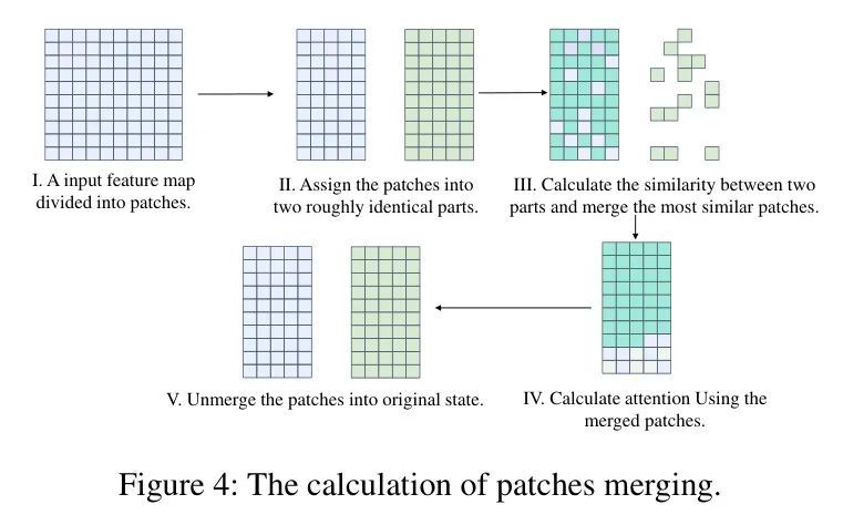 为了提高推理速度,作者受[1]中词元合并的启发,将 Patch 合并嵌入到去噪模型中。这种方法受到 transformer 架构内用于计算注意力机制的 Patch 数量显著大于 UNet 的观察。计算流程如图4 所示。对于特征图,作者首先计算每个 Patch 与特征图之间的相似性,并将最相似的 Patch 合并以减少被注意力机制处理的 Patch 数量。在计算注意力后,作者解开 Patch 以保持模型下一层的原输入大小。通过将 Patch 合并集成到作者的框架中,作者旨在简化过程并提高整体效率,同时不改变每层的基本操作。