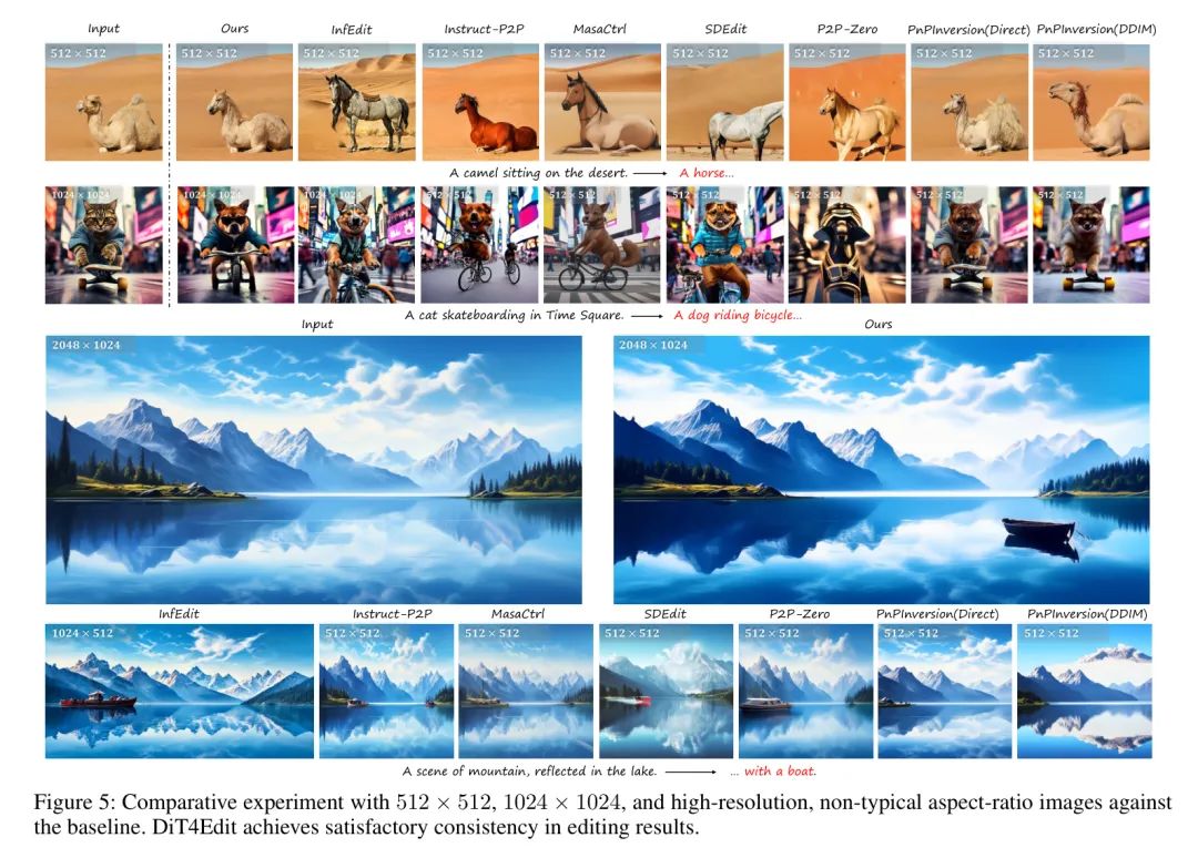 如图5所示,作者在512×512和1024×1024图像上比较了作者的方法。图5的第一行展示了作者的框架能够生成在编辑真实512×512图像时保持与原始内容一致的编辑图像,而现有方法通常会改变原始图像的背景或目标细节。此外,图5的第二和第三行说明了作者在大规模图像(任意尺寸)和目标图像上的实验,这些任务是以前基于UNet的方法难以解决的。结果表明,作者提出的框架在大规模图像上有效地处理了风格和目标形状的修改。