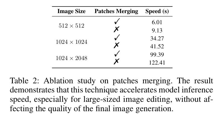 作者进行了一系列的消融实验来证明 DPM-Solver反演 和 Patch 合并的有效性。作者的 Patch 合并 消融实验的结果如图4和表2所示。Patch 合并导致了大型图像编辑时间的显著减少,同时保持了与不进行 Patch 合并时相当的质量。这表明 Patch 合并可以显著提高图像编辑框架的整体性能。此外,DPM-Solver和DDIM的消融实验结果如图7所示。