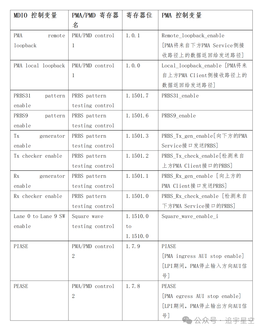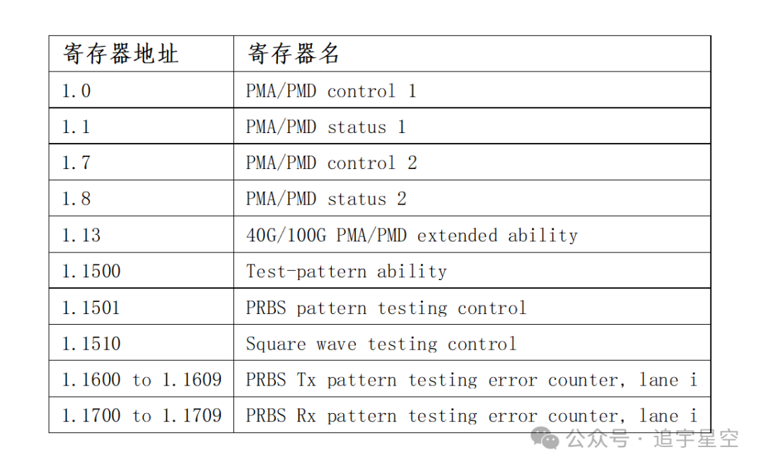 与PMA相关的寄存器集中在C45寄存器MMD=1(PMA/PMD)、MMD=8(Separated PMA (1))、MMD=9(Separated PMA (2))、MMD=10(Separated PMA (3))和MMD=11(Separated PMA (4))里。MMD8, MMD9, MMD10, MMD11与MMD1功能定义相同。下面对MMD1做一个简单的介绍。