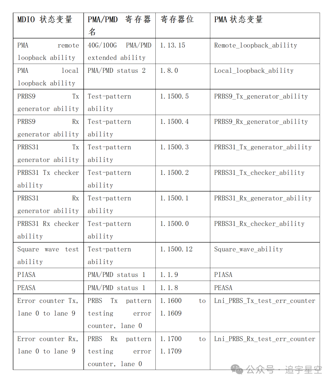在每个发送方向上生成每个相应测试模式的能力由PRBS9 _Tx_generator _ability、PRBS9 _Rx_generator _ability、PRBS31 _Tx_ggenerator _ability和PRBS31 _Rx_ggenerator _ability状态变量表示,如果实施了C45 MDIO,则可以分别通过位1.1500.5、1.1500.4、1.1500.3和1.1500.1访问这些状态变量。