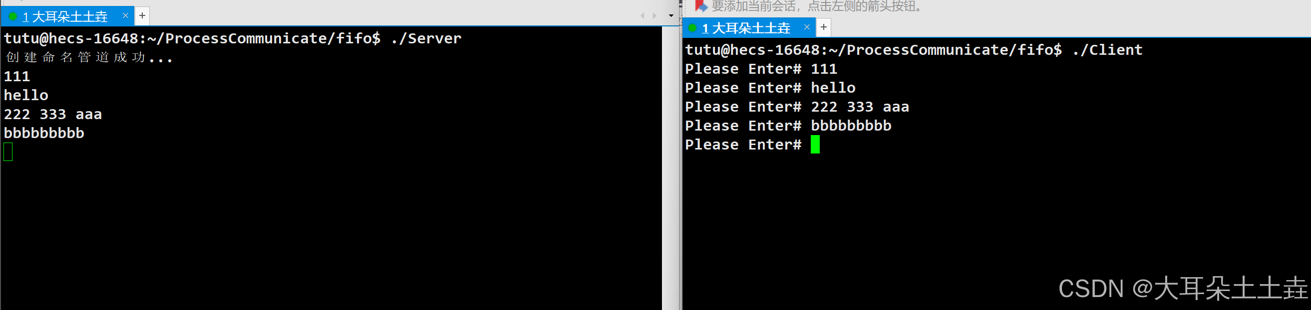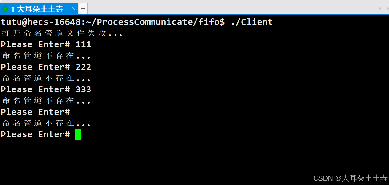 上述命名管道的使用由先打开Server可执行程序,Client可执行程序还未打开,Server进程会阻塞在打开命名管道文件说明当前命名管道是使用阻塞模式打开的