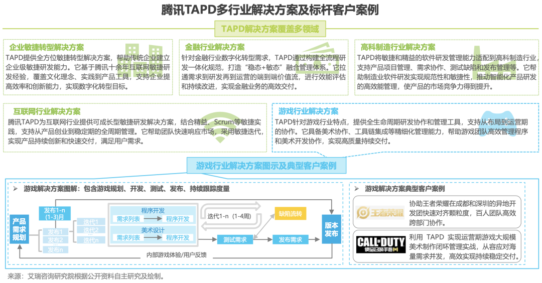 艾瑞报告指出:腾讯TAPD敏捷协作平台为多行业提供定制化的解决方案,其优势在于能够深入理解不同行业的特定需求,在配置个性化需求接口和定制化增值服务的前提下,进一步提供贴合行业需求的标准化模板,为各行业企业研发快速赋能。其覆盖的行业不仅包含研发是重要生产力的游戏和金融,还扩展至互联网成长型企业、高科技制造行业产品研发管理,以及传统行业的敏捷转型,通过提供全面的敏捷实践支持和工具链整合,帮助企业提升研发效能,加速产品创新和市场响应速度。