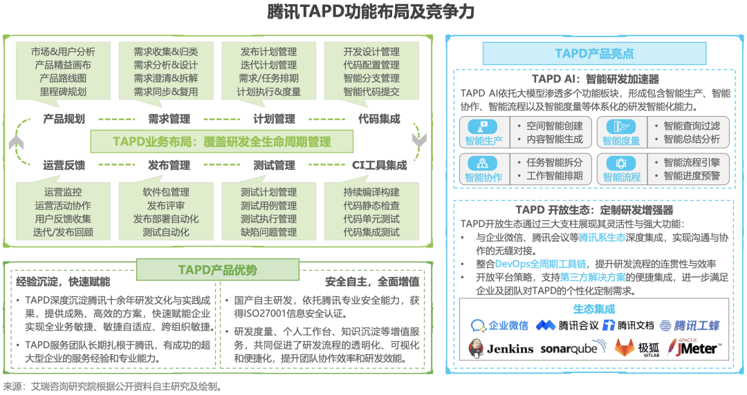 腾讯TAPD敏捷协作平台是支撑腾讯旗下包括QQ、微信、企业微信和腾讯会议等产品敏捷研发实践的关键工具,平台建立了一套成熟的研发体系,覆盖了研发理念、方法、实践和工具,全方位敏捷支持企业研发。艾瑞报告指出:TAPD不仅具备“行业Know How沉淀”和“安全自主”的优势,平台还具备AI融合和生态开放两大亮点,能够实现解决方案标准化与个性化之间的最优平衡,满足不同规模和行业的团队在敏捷研发上的需求。