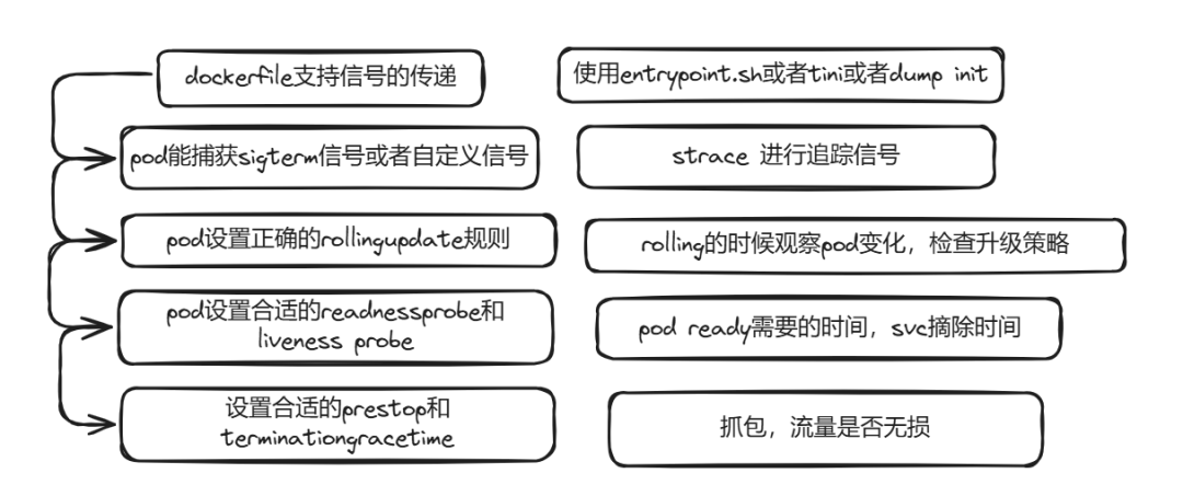 在进行长连接销毁的时候,涉及到的是一个是老的连接,一个是新的连接,对于新的连接来说,需要的是pod的状态是ready的,也就是能正常的为客户端提供服务,也就意外着pod的liveness和readyness两个健康检查要进行配置,否则没准新请求就挂了,还没有ready就把流量调度上去了;而对于老的连接来说,主要是多久处理完成,从而对老的pod给予多少宽限的时间,也就是gracetime的设置,一个请求的最长超时时间是多久,太长的请求,其实。。。抛弃也无所谓了。