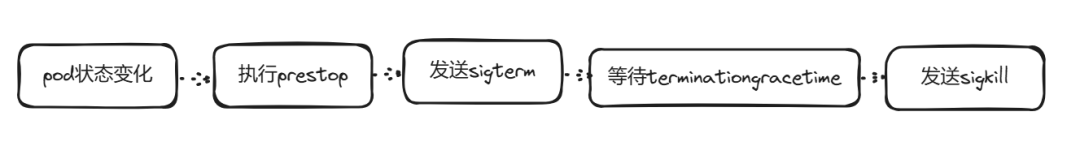 pod的状态变化,可以是使用命令kubectl进行手动删除pod,也可以是deployment在进行更新pod镜像的时候,pod的状态会先变成terminating,然后开始执行pod的prestop逻辑,执行一些必要的清理工作,然后当prestop执行完成之后,kubelet就会发送sigterm信号进行关闭pod,然后等待terminationgracetime,默认是30秒,到了时间之后,就会发送sigkill信号强制杀死pod,也就完成了一个pod的生命周期。