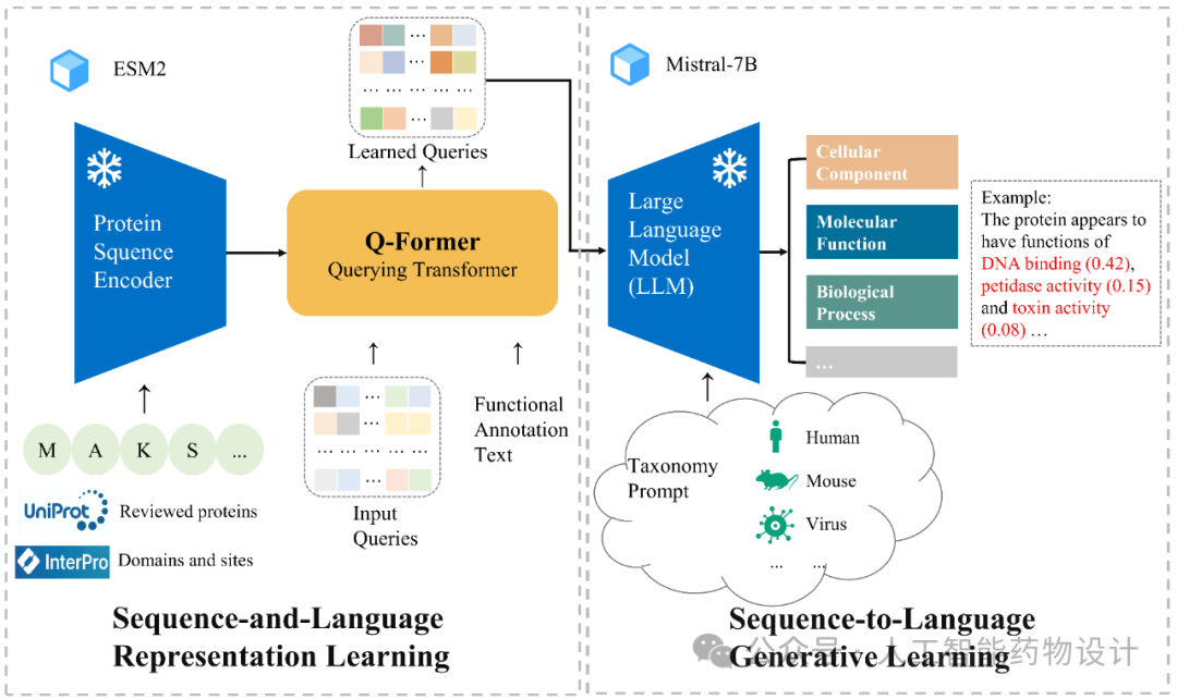 图1. FAPM的模型结构。左边为序列和语言表征学习阶段,FAPM使用ESM2对蛋白质序列进行编码,并使用Q-Former将其与功能文本(GO标签)对齐。右边为序列到语言的生成学习阶段,Mistral-7B语言模型处理前一阶段学习到的查询,并结合一些额外的提示信息,生成带有相关概率的GO标签预测。InterPRO数据库中的蛋白质功能域数据和UniProt数据库中的已验证蛋白质被用于训练模型。