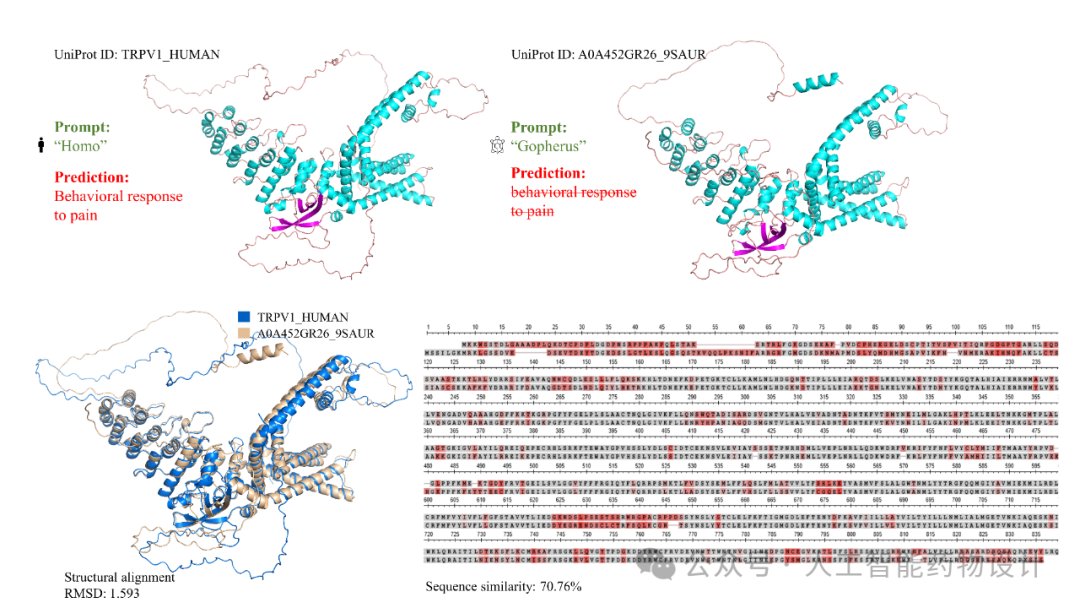 研究人员观察到,引入物种提示信息能够提高预测的准确性,尤其是在BPO和CCO这两个类别中。一种可能的解释是,提示中的物种信息与特定的功能密切相关。这种猜测得到了图3中不同功能同源蛋白案例的支持。将分类信息(如“Homo”)作为提示添加到FAPM的语言端模型后,研究人员观察到模型生成能力发生了一些变化,成功避免了一些基本错误并提高了预测质量。图4展示了一对同源蛋白TRPV1_HUMAN和A0A452GR26_9SAUR,分别属于人类和野鸡。尽管这两个蛋白具有高度相似性,序列相似性为70.76%,结构RMSD值为1.593,然而,它们在作为辣椒素受体(TRPV1)的功能上存在关键差异。