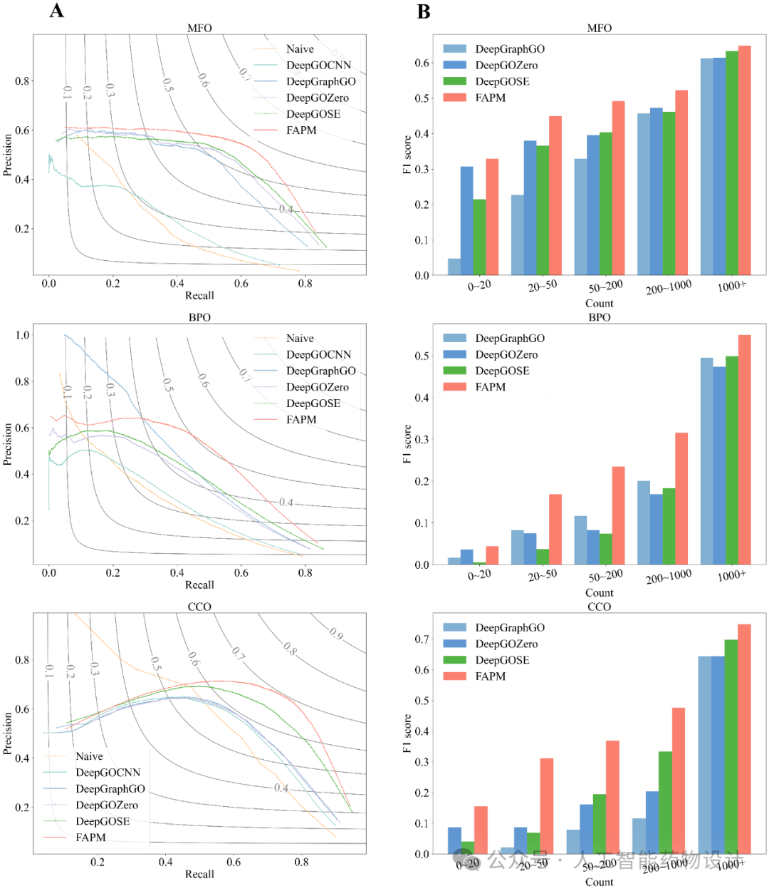 图3. 蛋白功能预测效果对比。A. 准确率-召回率曲线对比。B. 不同频率标签预测效果对比。