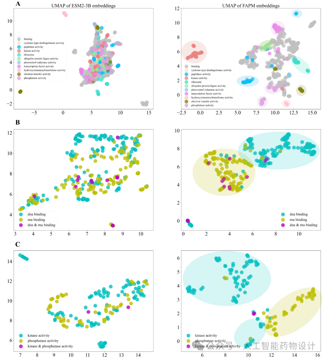 图5. ESM2与FAPM在特定GO功能上的蛋白质表征的差异。所有样本均来自Swiss-Prot数据集的测试集。A.具有十余中最常见功能中任意功能的的蛋白质的表征。B.具有DNA/RNA结合功能的蛋白质的表征。C.具有激酶/磷酸酶活性功能的蛋白质的表征。