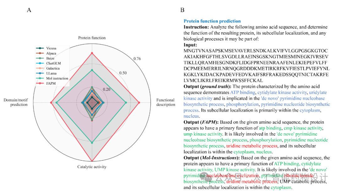 鉴于FAPM框架集成了语言模型,一个自然而然的研究方向是将FAPM与那些直接利用语言模型进行功能预测的方法进行对比,从而评估其在蛋白质功能预测任务中的性能表现。研究人员利用Mol-Instructions定义的蛋白质指令数据集及其预定义的训练/测试分割,训练了一版专门用于对比的FAPM模型。图2(A)的雷达图展示了在功能分类、功能描述、催化活性以及功能域预测四项任务中,八种方法的Rouge-L指标,其中FAPM对应最外围的红线,次优方法Mol-Instructions对应中间的绿线。图2(B)中展示了一个具体的预测案例,可以看出,对“UMP-CMP激酶”的预测结果中,FAPM生成的内容错误更少,在功能描述上与真实结果能更好地对齐,并成功预测出Mol-Instructions未能识别的功能(“phosphorylation”和“nucleus”)。