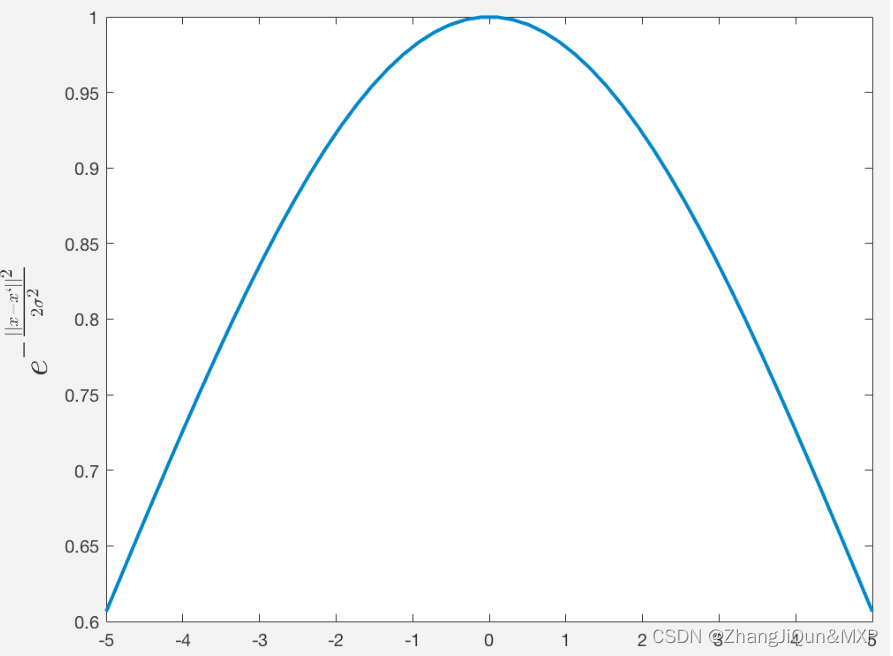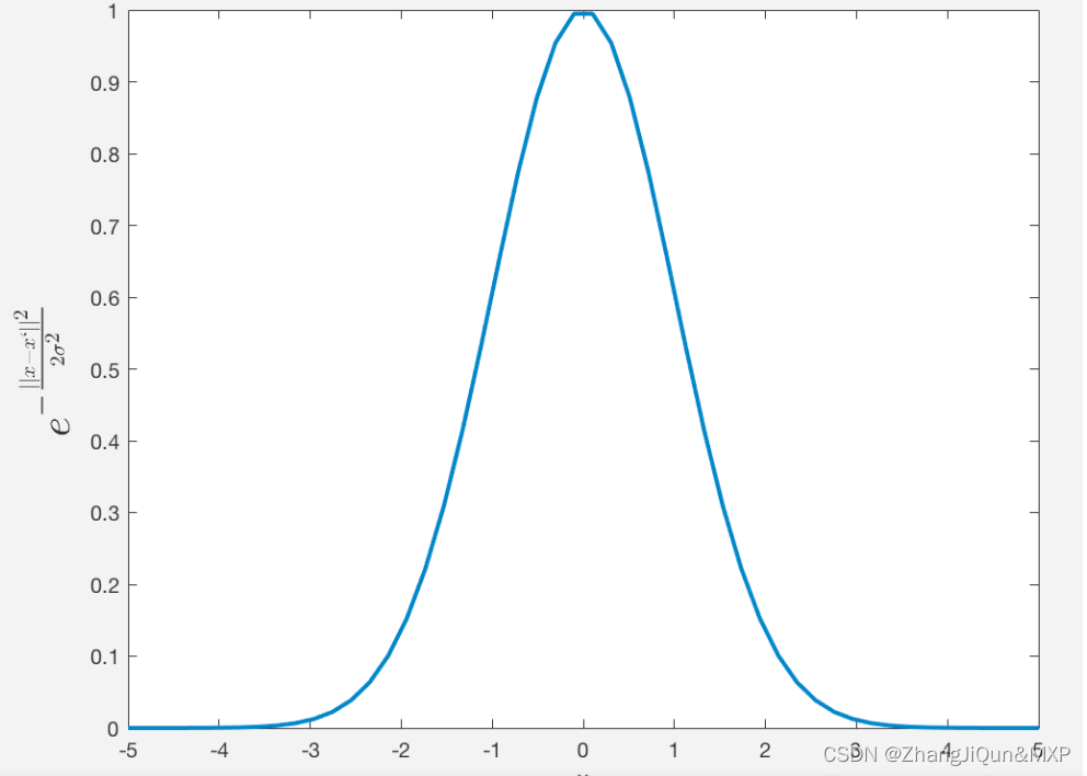 上述公式涉及到两个向量的欧式距离(2范数)计算,而且,高斯核函数是两个向量欧式距离的单调函数。 σ 是带宽,控制径向作用范围,换句话说, σ控制高斯核函数的局部作用范围。当 x 和x′ 的欧式距离处于某一个区间范围内的时候,假设固定 x′, k(x,x′)随x的变化而变化的相当显著。