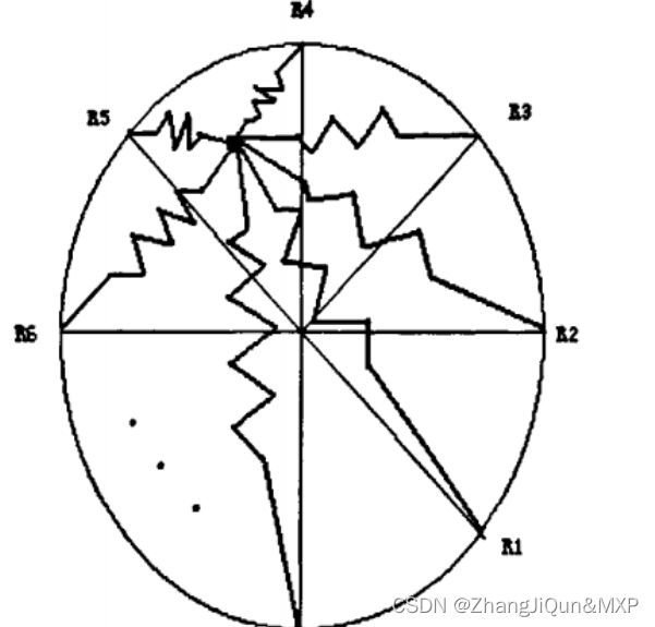 Radviz可视化原理是将一系列多维空间的点通过非线性方法映射到二维空间的可视化技术,是基于圆形平行坐标系的设计思想而提出的多维可视化方法。圆形的m条半径表示m维空间,使用坐标系中的一点代表多为信息对象,其实现原理参照物理学中物体受力平衡定理。