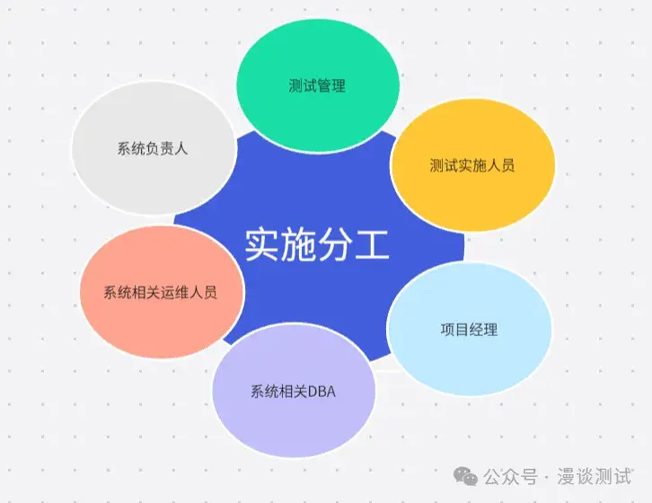 为了达到质量共建的目的,加强各供应商质量共建意识,本文对生产测试项目的角色分工做详细介绍。实施团队的主要角色如下图所示,包括测试管理、测试实施人员、项目经理、系统相关DBA、系统相关运维人员、系统负责人。