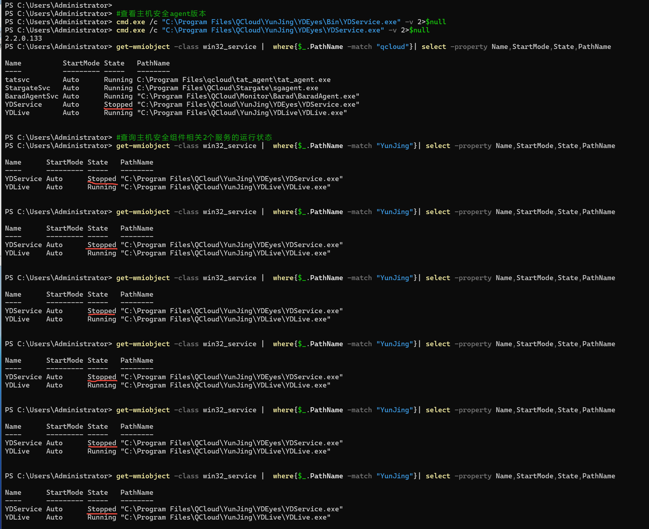 cmd.exe /c "C:\Program Files\QCloud\YunJing\YDEyes\Bin\YDService.exe" -v 2>$null