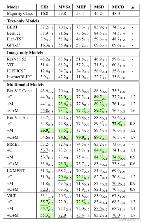 - 此外,文章还介绍了实验设置、使用的数据集、单模态方法、多模态模型、评估方法和结果。研究者们使用了不同的预训练模型,包括 BERT、Bernice、ResNet152 和 ViT,并在不同的社交媒体任务上进行了实验,如文本-图像关系分类、情感分析、仇恨言论分类、讽刺检测和商业影响力内容检测等。