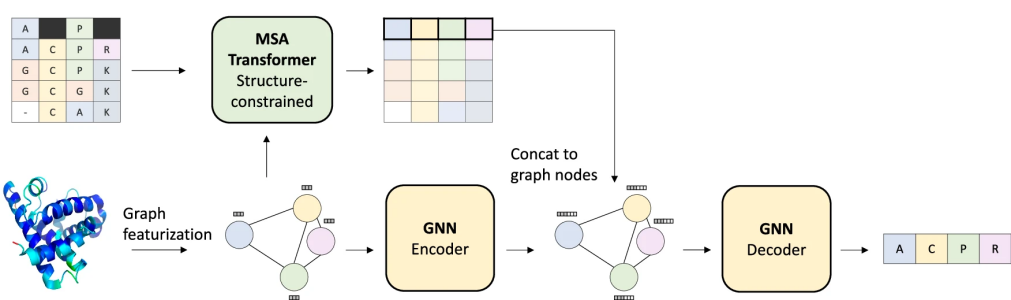 如图1所示,SSEmb模型结合了多序列比对(MSA)和蛋白质结构信息,并通过自监督方式进行训练。蛋白质结构数据来源于CATH 4.2数据库,其中包含18,204个经过非冗余处理的蛋白质。每个结构对应生成了一个MSA。训练前,作者通过序列相似性(95%)筛除与验证集和测试集重复的蛋白质。在训练过程中,SSEmb随机屏蔽序列中的部分氨基酸位置,并通过预测这些屏蔽位置的氨基酸类型进行优化。模型引入结构约束,仅允许MSA Transformer关注三维结构中空间接近的残基,同时将提取的最后一层MSA嵌入与结构信息结合,作为输入节点传递给图神经网络(GNN)。其中,MSA Transformer使用预训练权重初始化,而GNN从零开始训练,架构类似于几何向量感知器(GVP)模型。