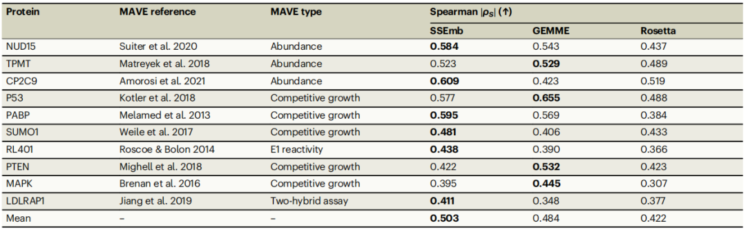如表1所示,SSEmb与GEMME(基于MSA的进化模型)和Rosetta(基于结构的稳定性预测工具)进行了对比。在活性预测上与GEMME表现相当,但在丰度预测中表现更优,说明结构信息的引入提升了预测效果。总体上,SSEmb在活性和丰度效应的相关性上均表现出较高的准确性。