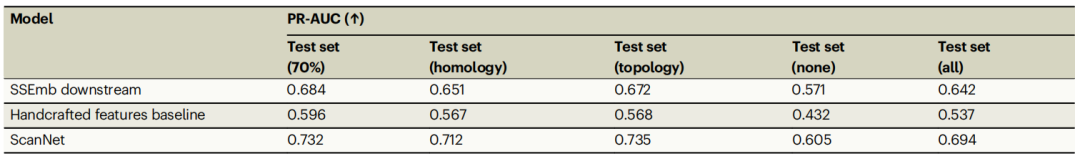 SSEmb的嵌入包含结构和序列信息,有助于识别结合位点。通过训练一个下游模型,利用SSEmb嵌入预测蛋白质结合位点(PPI),结果显示其性能介于专用模型ScanNet和基线模型之间(表4)。这验证了SSEmb嵌入在结合位点预测及其他下游任务中的潜力。