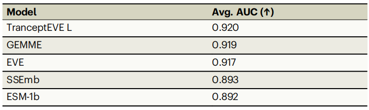 由于蛋白质功能和稳定性的丧失与致病性变异密切相关,SSEmb在预测变异效应的同时也能用于零样本变异致病性预测。在含有临床注释的大规模变异数据集中,SSEmb与其他预测方法相比整体表现较好(表3),但MAVEs效应预测和致病性分类在任务性质上有所差异。