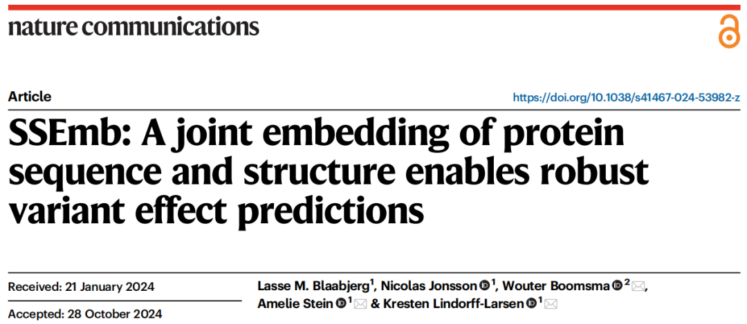 Blaabjerg L M, Jonsson N, Boomsma W, et al. SSEmb: A joint embedding of protein sequence and structure enables robust variant effect predictions[J]. Nature Communications, 2024, 15(1): 9646.