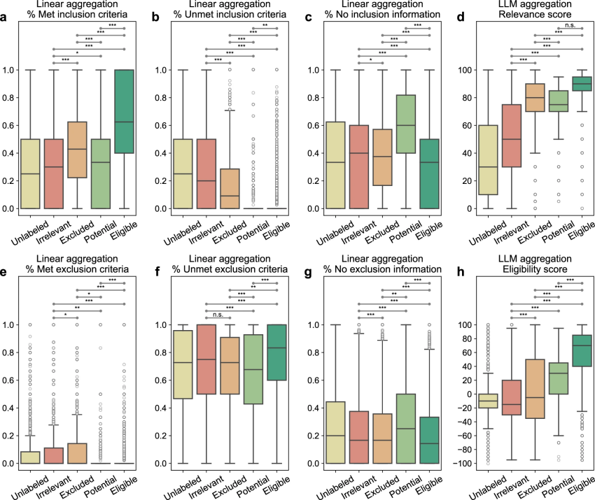 线性聚合:通过统计六种不同标准级适应性预测的百分比来计算六个评分。图4a展示了被预测为“纳入”的纳入标准百分比,结果表明,在合格的临床试验中,患者满足的纳入标准比例最高,而在无关的临床试验中则最低;对于相关但不合格的试验,满足的标准比例介于两者之间。图4b则展示了预测为“未纳入”的纳入标准百分比,其趋势大致与图4a相反。
