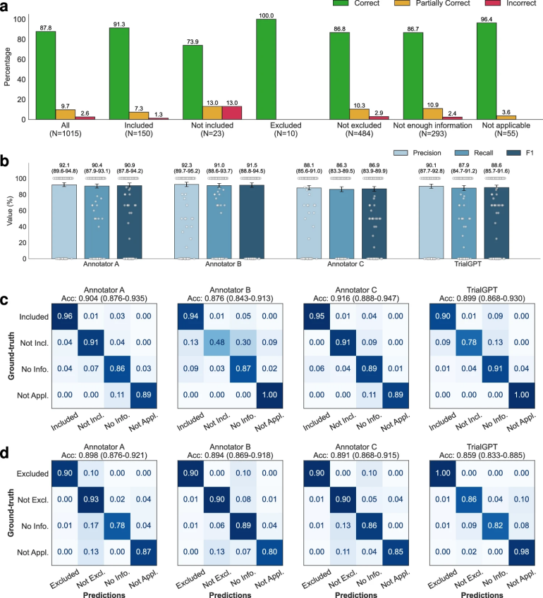 在评估适应性预测时,图3c和图3d展示了TrialGPT与专家标注的混淆矩阵。整体而言,TrialGPT-Matching在标准级预测准确度为0.873,接近专家的表现(0.887–0.900)。对于纳入标准,TrialGPT的预测准确度为0.899,位于专家的准确度范围(0.876至0.916)内。这表明,TrialGPT能够准确地预测患者在标准级的适应性,其表现接近人类专家。