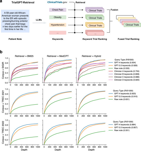 TrialGPT-Retrieval可以生成关键词,有效地筛选临床试验。图2a展示了在检索阶段,大型语言模型被用来生成用于初步筛选临床试验的关键词。每个关键词经过混合检索器匹配词汇和语义信息,从而获得相关临床试验列表,并通过互惠排名融合将结果合并为排名列表。作者使用三组数据集评估了由GPT-4和GPT-3.5生成的关键词的检索性能,并与直接使用原始患者记录进行试验检索进行了比较。图2b展示了在不同检索深度下,相关临床试验的召回率。