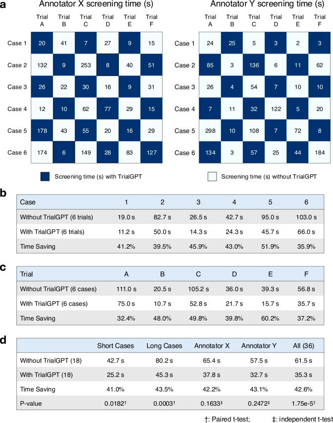 图5b展示了匹配效率的对比结果。使用TrialGPT时,两位标注员在筛选效率上没有显著差异(32.7秒与37.8秒,p=0.73),但在筛选时间上有明显的时间节省。不同患者的时间节省为35.9%至51.9%,不同试验的时间节省为32.4%至60.2%。总体来说,长案例比短案例节省的时间更多(长案例为43.5%,短案例为41.0%)。所有患者-试验配对的整体时间节省约为42.6%,这表明TrialGPT能显著提高患者招募的效率。