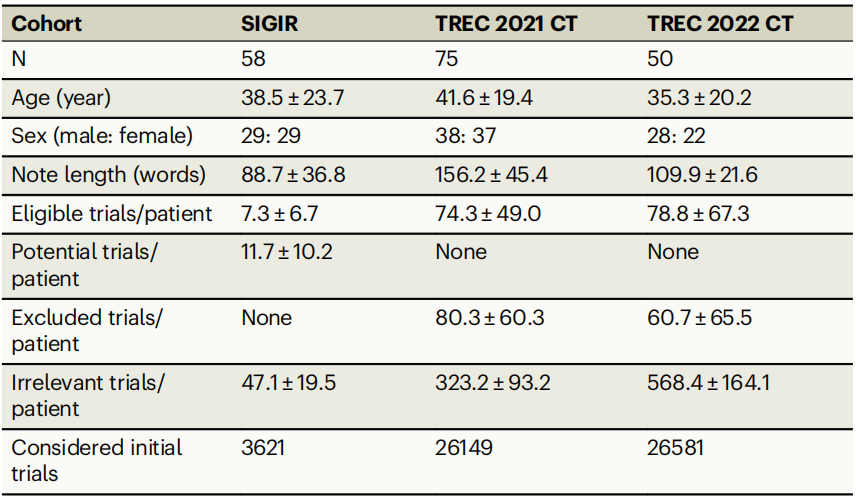 为了评估TrialGPT,作者使用了来自三个公开数据集的患者摘要和临床试验数据:2016年由信息检索特别兴趣小组(SIGIR)发布的患者-试验匹配测试集,以及2021年和2022年文本检索会议(TREC)临床试验(CT)赛道的数据。SIGIR数据集包含三种患者-试验适应性标签:无关(“不会将此患者推荐到该临床试验”)、潜在(“考虑进一步调查后可能推荐此患者参加该临床试验”)和合格(“非常可能将此患者推荐到该临床试验”)。TREC数据集也有三种适应性标签:无关(“患者与试验没有任何相关性”)、排除/不合格(“患者符合试验目标疾病,但排除标准使其不合格”)和合格(“患者符合参加试验的条件”)。患者队列的基线统计数据见表1。