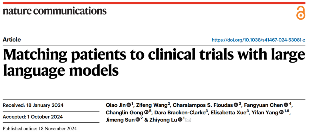 Jin Q, Wang Z, Floudas C S, et al. Matching patients to clinical trials with large language models[J]. Nature Communications, 2024, 15(1): 9074.