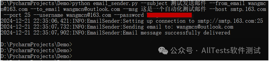 python email_sender.py --subject 测试发送邮件 --from_email wangmcn@163.com --to_email wangmcn@outlook.com --msg 这是一个自动化测试邮件 --host smtp.163.com --port 25 --username wangmcn@163.com --password XXXXXX
