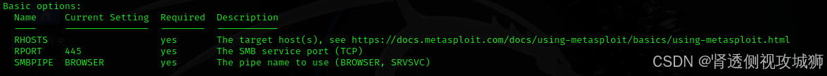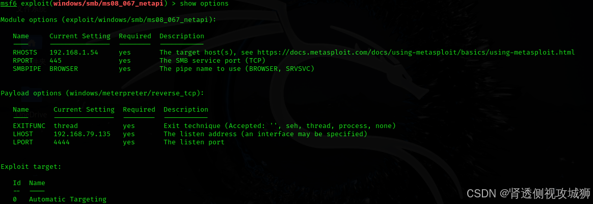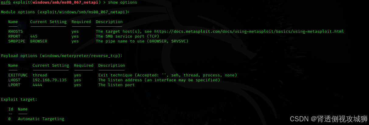 Module options (exploit/windows/smb/ms08_067_netapi):