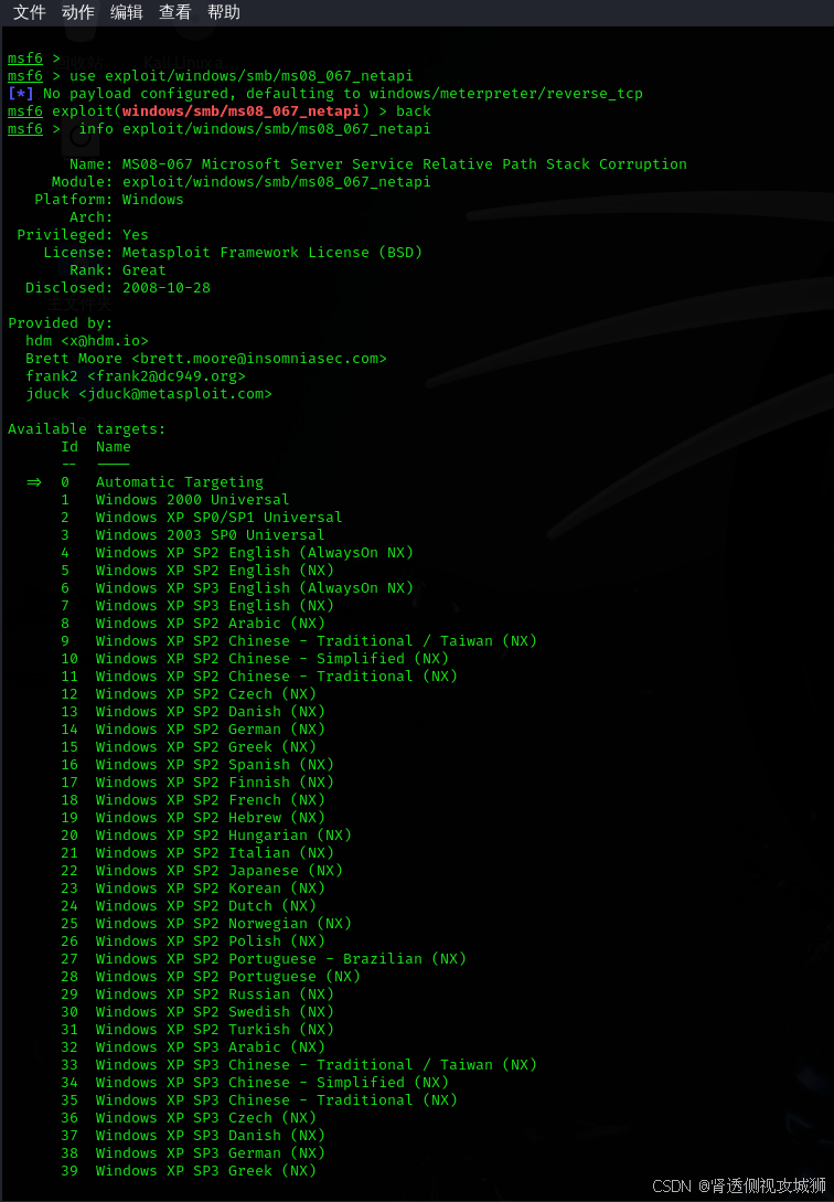 msf6 exploit(windows/smb/ms08_067_netapi) >