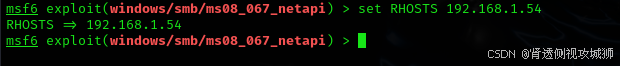 msf6 exploit(windows/smb/ms08_067_netapi) > set RHOSTS 192.168.1.54
