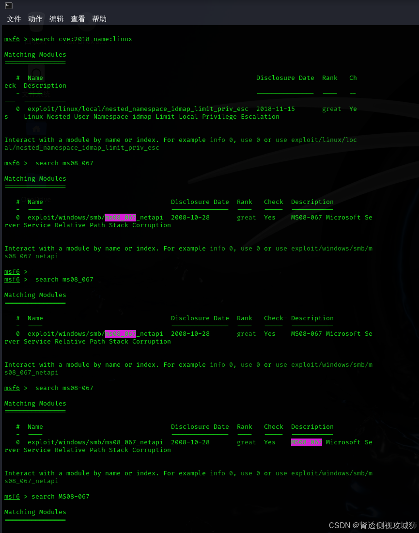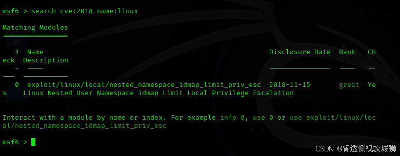 msf6 > search cve:2018 name:linux #查找 2018 年 linux 相关的漏洞模块