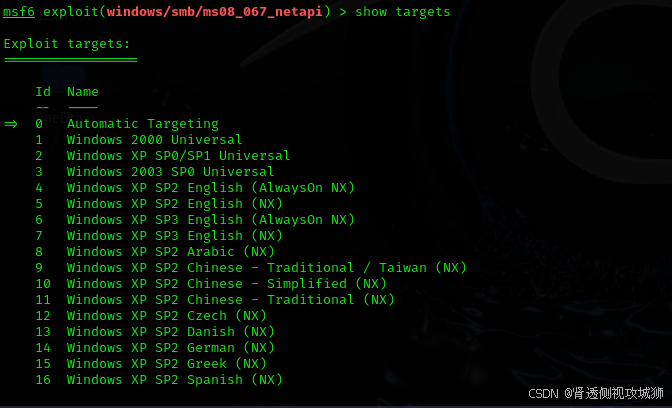 msf6 exploit(windows/smb/ms08_067_netapi) > show targets