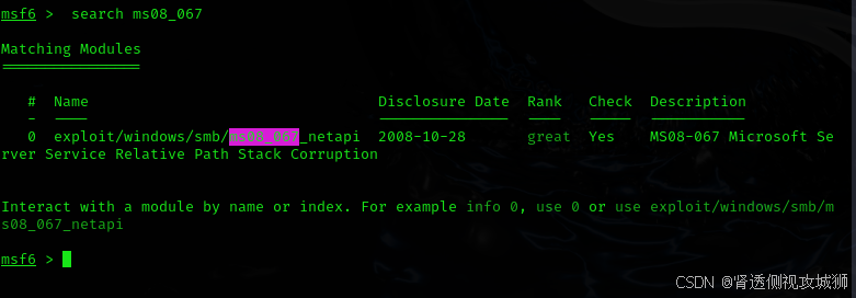 Interact with a module by name or index. For example info 0, use 0 or use exploit/windows/smb/ms08_067_netapi