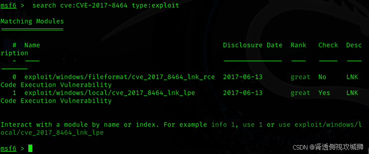 msf6 > search cve:CVE-2017-8464 type:exploit #查找:CVE-2017-8464 远程命令执行漏洞