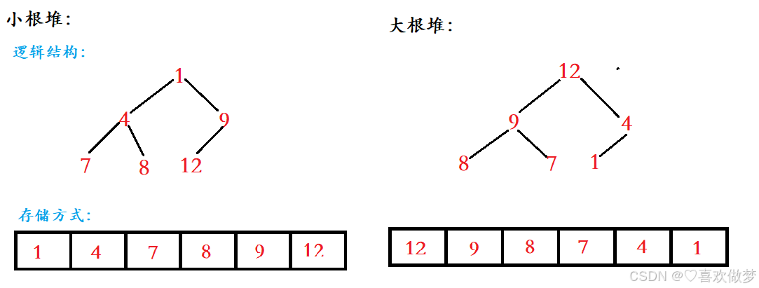堆是一种特殊的完全二叉树,如果有一个关键码的集合K={k0,k1,k2,...,kn-1},把它所有的元素按照完全二叉树的顺序存储方式在一维数组中,并满足:Ki<=K2i+1且Ki<=K2i+2(Ki>=K2i+2)i=0,1,2,3....,则称为小堆。堆有两种类型分别为大根堆和小根堆: