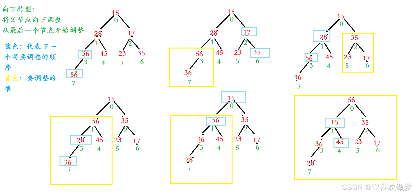 //交换完,将父节点等于下一个子节点,看下一个堆是否形成大堆,
