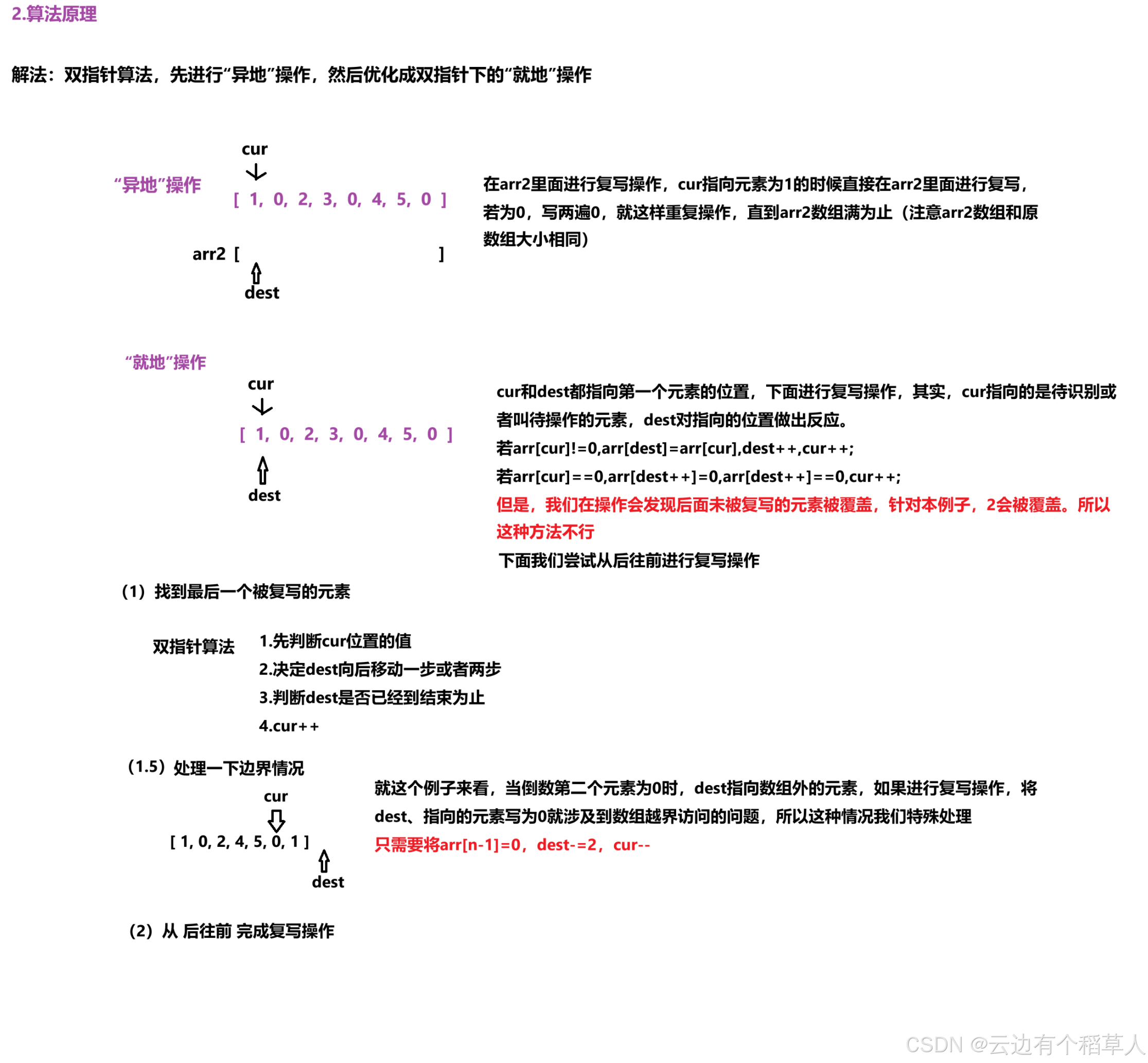 这种题我们一定得动手在草稿纸上模拟,模拟一开始的就地操作,后来的异地操作,还有特殊的情况,只有思维浸在里面才能真正理解每一步和其对应的解决办法,不断地练习坚持,才会有可能举一反三。