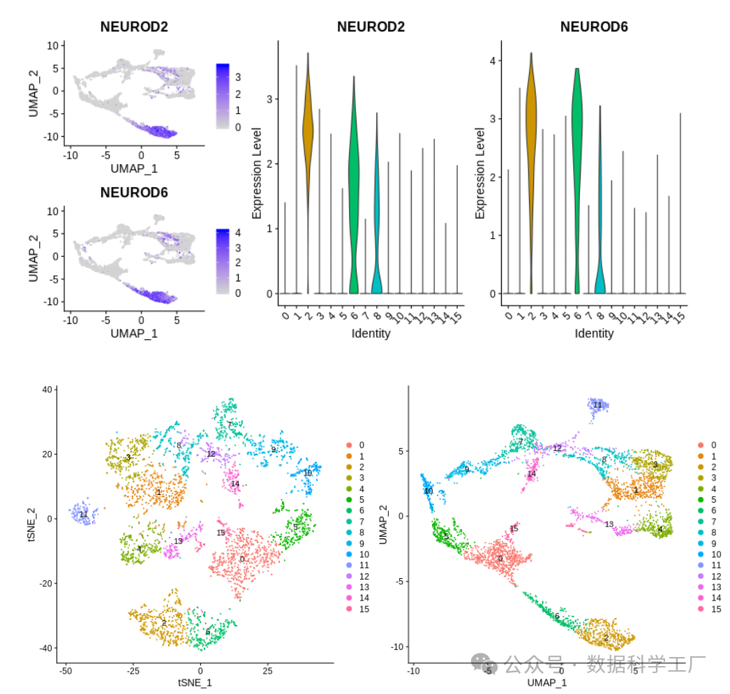 可以通过特征图或小提琴图更详细地查看不同细胞群的标记基因。例如,NEUROD2 和 NEUROD6 是第 2 群的显著标记基因,可以进一步分析它们的表达情况。